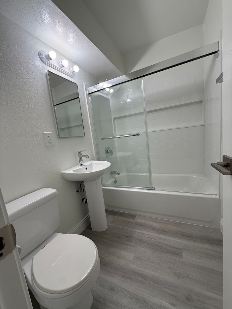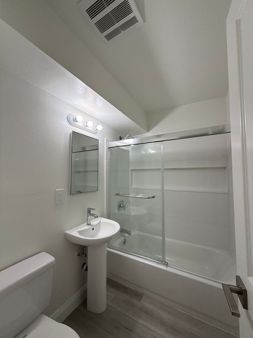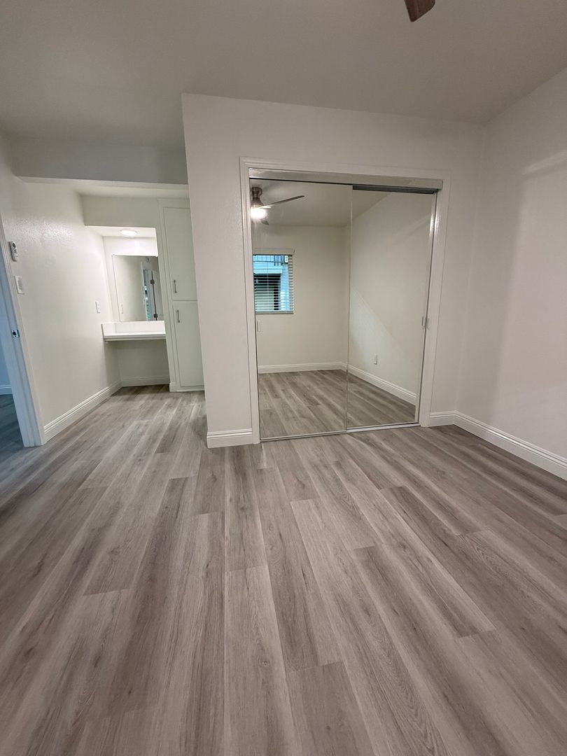 In a private gated community, this spacious, downstairs unit is fully remodeled and boasts newer updated paint, hardwood flooring, ceiling fans, and much more. Includes 1 uncovered parking space. Tenant pays all utilities.